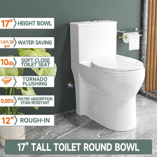 1-Piece Toilet 17 in. ADA Toilet Round Dual Flush 1.0/1.28 GPF in White with Soft Close Seat Included 12 in. Rough In
