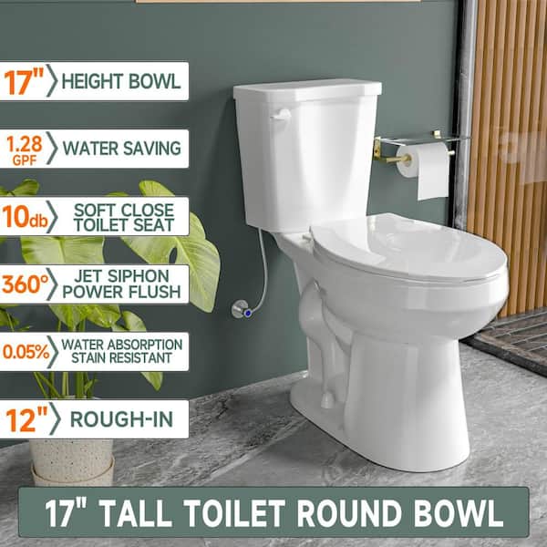 17 in.Toilet Comfort ADA Chair Height 1.28 GPF Single Flush Round 2-Piece Toilet in White with Quiet-Close Seat Included