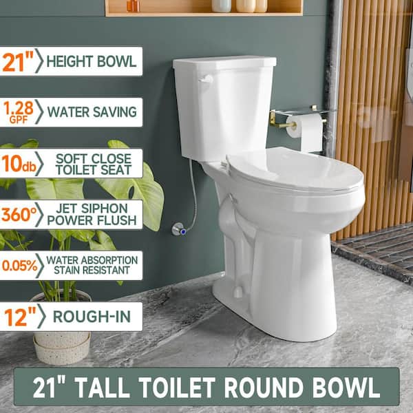 21 in. Height Toilet 1.28 GPF Single Flush 2-Piece Extra Tall Toilet Round in White with Soft Close Seat for Seniors