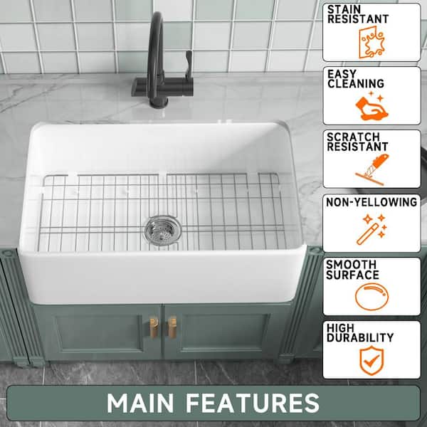 30 in. Farmhouse Sink White Fireclay Kitchen Sink Single Bowl Fireclay Sink with Bottom Grid and Drain Barn Kitchen Sink