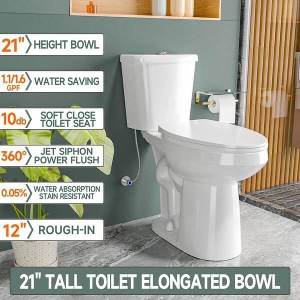 Dual Flush Elongated 21 in Toilet 2-Piece White 1.0/1.28 GPF Extra Tall Height with Soft Close Seat 12 in. Rough In