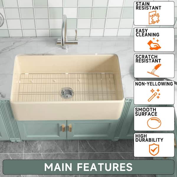Farmhouse Kitchen Sink 33 in. L x 18 in. W Apron Front Single Bowl Fireclay Sink Bone with Bottom Grid and Sink Strainer