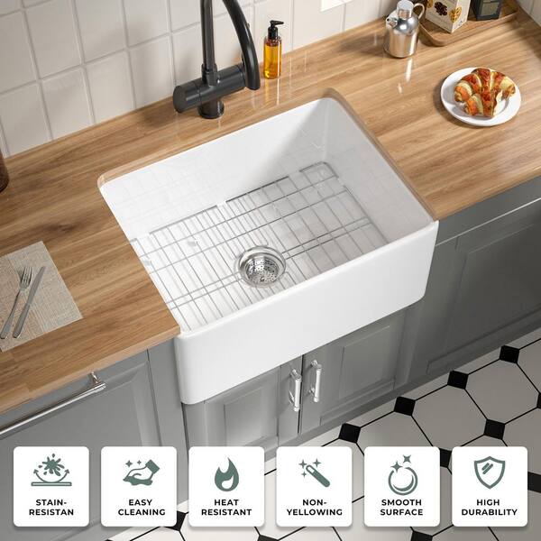 Farmhouse Sink 24 in. Fireclay Farmhouse Kitchen Sink Apron Front Single Bowl Fireclay Sink in White with Grid and Drain