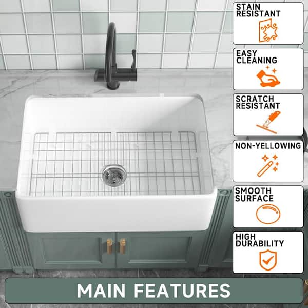 Fireclay Farmhouse Sink 30 in. Single Bowl White Farmhouse Kitchen Sink Apron Front Undermount with Grid and Sink Drain