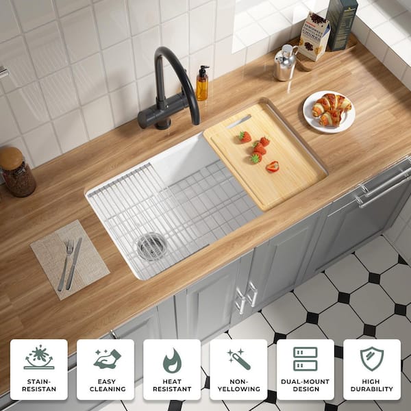 Kitchen Sink 33 in. Dual Mount Drop-In/Undermount Single Bowl White Fireclay Workstation Kitchen Sink with Cutting Board