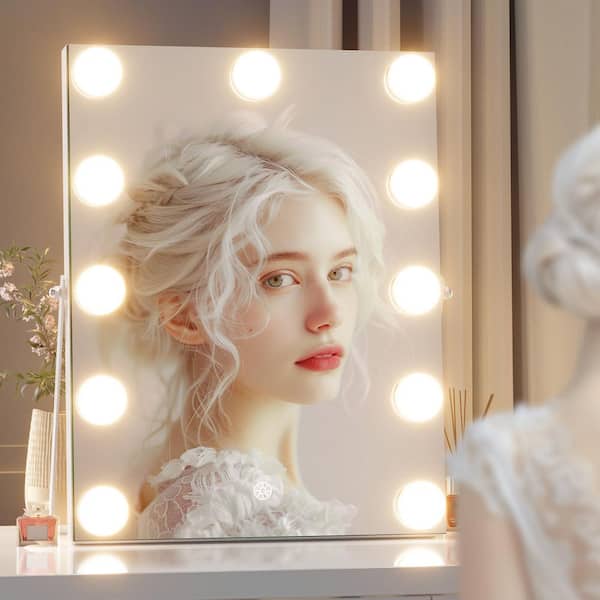 White 11 in W x 14 in. H Rectangle Framed Vanity Mirror with Lights Hollywood Makeup Mirror with10X Magnification