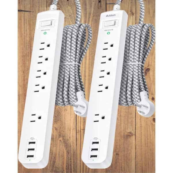 5 Widely Spaced Outlets 3 USB Charging Port, 1875W/15A with 5 ft. Braided Extension Cord, Flat Plug, Wall Mount (2-Pack)