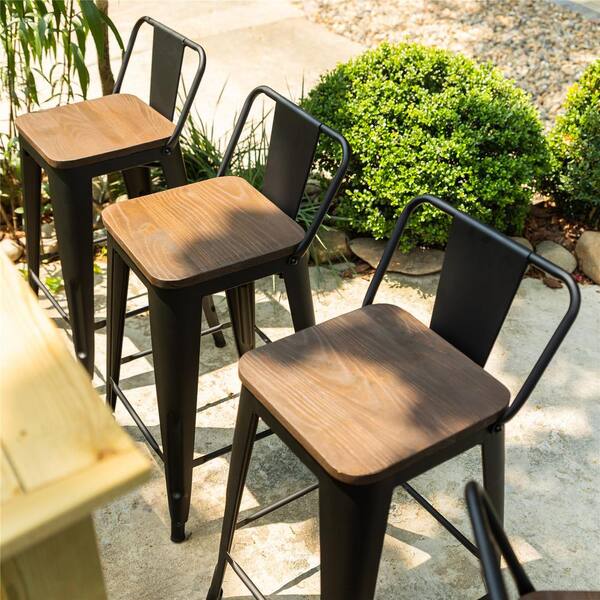 Vustu 31 in. Black Low Back Metal Frame Counter Stool With Solid Wood Seat ( Set of 4)