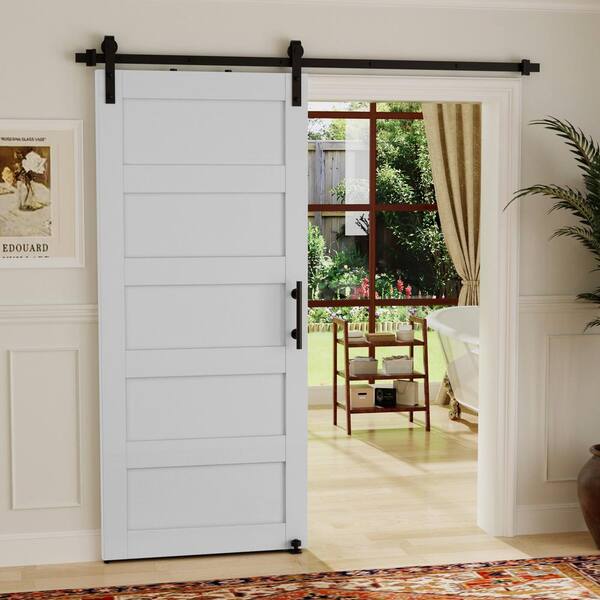 30 in. x 84 in. 5-Panel White MDF Sliding Barn Door Slab with Hardware Kit (with Round Tube Handrail and Sway Stop)