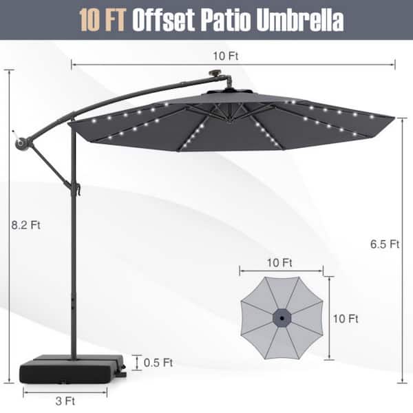 10 ft. LED Light Patio Cantilever Umbrella in Gray Outdoor Solar Tilt Umbrella with Crossed Stand and Sand Bags