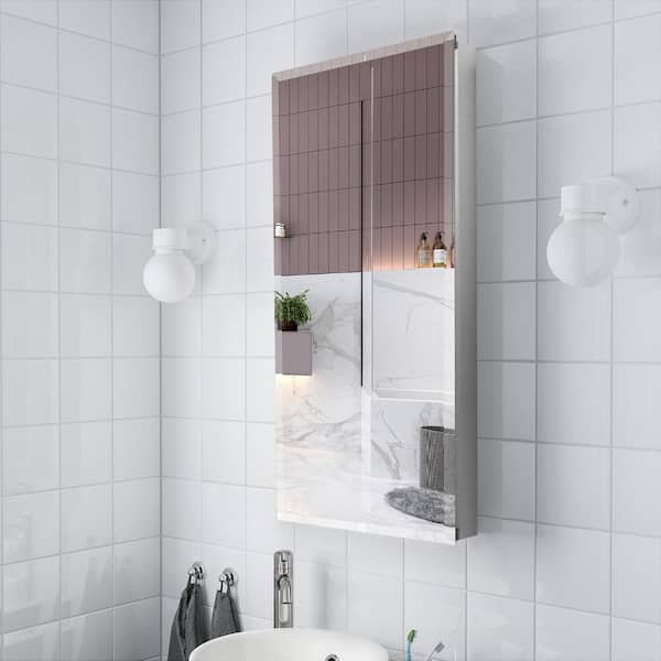 15 in. W x 36 in. H Satin Aluminum Recessed/Surface Mount Bathroom Medicine Cabinet with Mirror, 3 Glass shelves