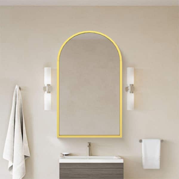 16 in. W x 30 in. H Arched Gold White Iron Medicine Cabinet with Mirror, Recessed or Surface Mount, Soft Close