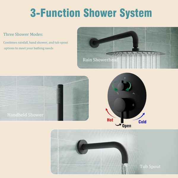 2 Handle 2-Spray Tub and Shower Faucet 2.5 GPM in Matte Black with 10 in. Rain Shower Head, Pressure Balance