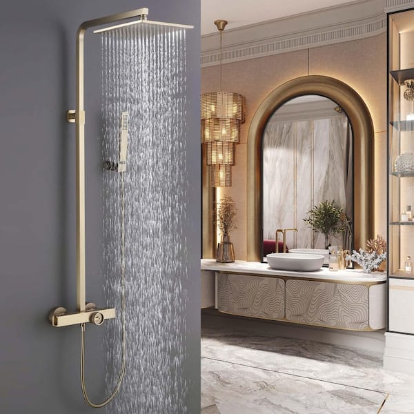 2-Spray 10 in. Dual Wall Bar Fixed and Handheld Shower Head 1.5 GPM in Brushed Gold Shower System with Tub Faucet