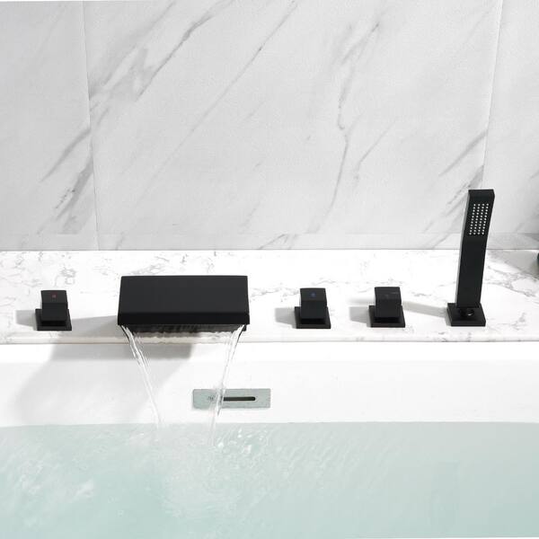 3-Handle Deck-Mount Waterfall Roman Tub Faucet with Hand Shower in Matte Black