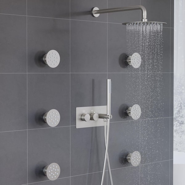 3-Spray 10 in. Wall Dual Fixed and Handheld Shower Head with 6 Body Jets in Brushed Nickel, Thermostatic Mixing Valve