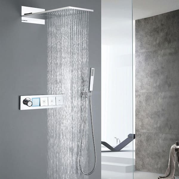 4-Spray Dual Wall Mount Fixed and Handheld Shower Head 1.59 GPM in Chrome LED Digital Display Thermostatic Shower Kit