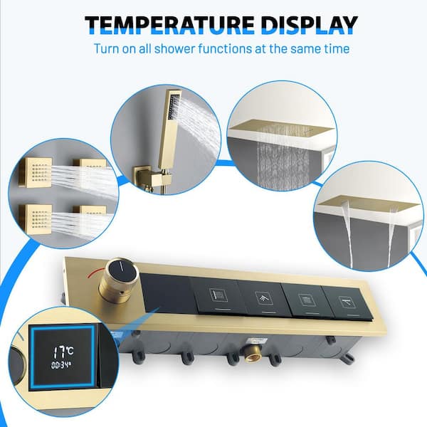 5-Spray Dual Ceiling Mount Fixed and Handheld Shower Head 1.59 GPM in Brushed Gold with 4 Body Jet, Thermostatic Value