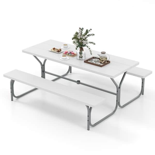 72 in. White Rectangle Metal Picnic Table Bench Set with HDPE Tabletop with Umbrella Hole for 8 Person