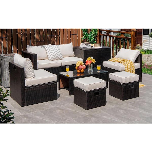 8-Piece Wicker Patio Conversation Set with White Cushions, Storage Box and Waterproof Cover
