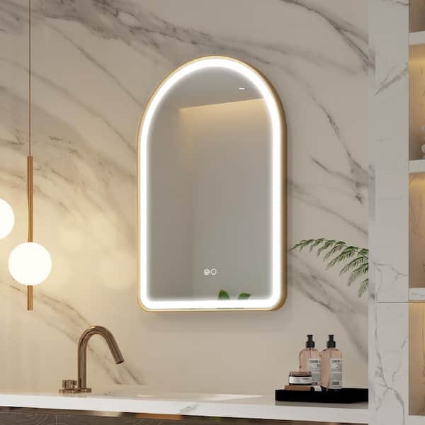 BONIE 24 in. W x 36 in. H Arched Framed LED Anti-Fog Wall Bathroom Vanity Mirror in Brushed Gold
