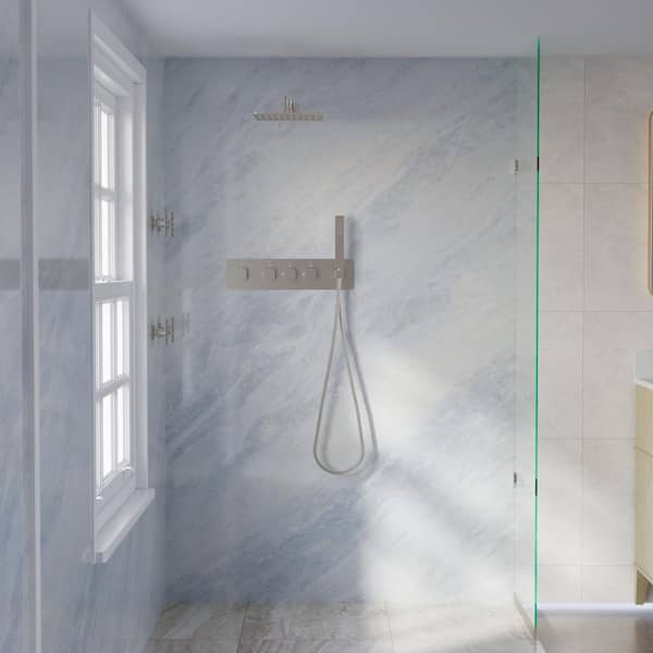 Dual Shower Heads Thermostatic Shower Faucet System 2.5 GPM with 4-Jets in Brushed Nickel (Valve Included)