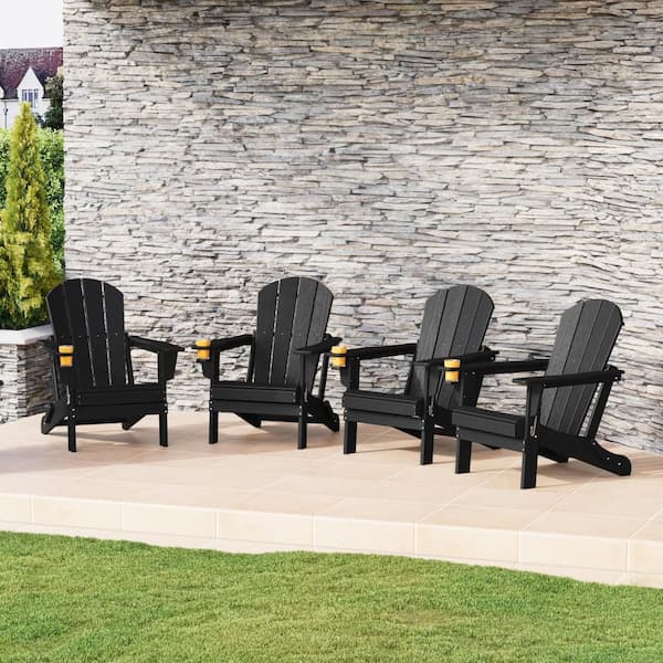 Alvaro Black Outdoor Patio Weather Proof HDPE Plastic Folding Adirondack Chair with Cup Holder, Set of 4