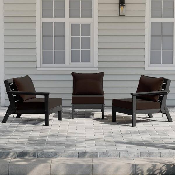 Birchwood Black Arrangeable Outdoor Patio 3-Piece Deep Seating HDPE Sofa Arm Chair Set w/ Brown Cushions