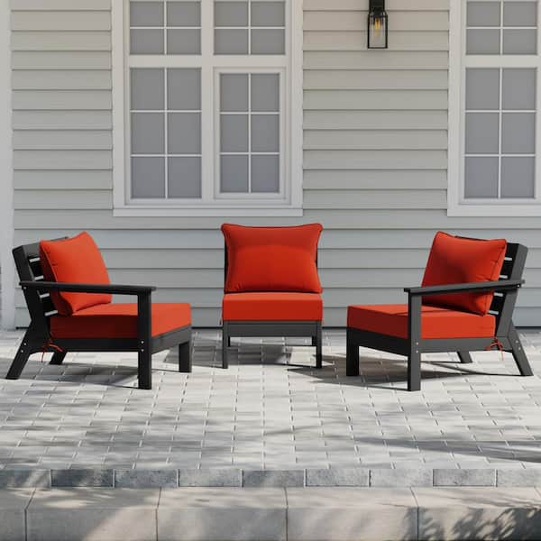 Birchwood Black Arrangeable Outdoor Patio 3-Piece Deep Seating HDPE Sofa Arm Chair Set w/ Orange Cushions