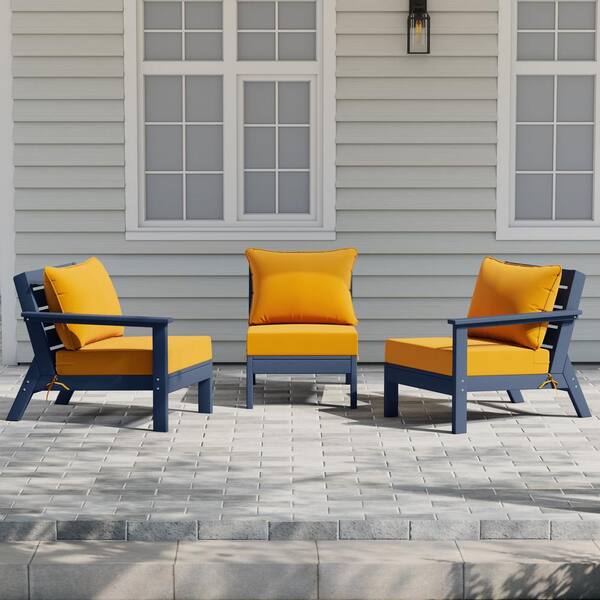 Birchwood Navy Blue Arrangeable 3-PC HDPE Deep Seating Outdoor Patio Conversation Sofa Armchair Set w/Yellow Cushions