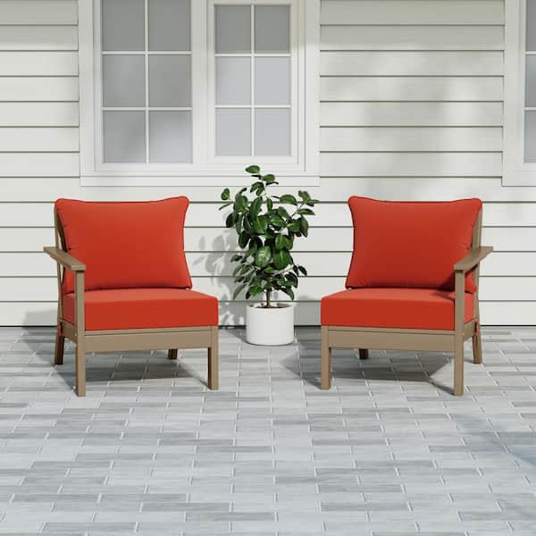 Birchwood Weathered Wood Arrangeable Outdoor Patio 2-Piece Deep Seating HDPE Loveseat Arm Chair Set with Orange Cushions