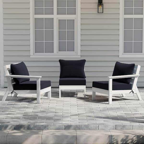 Birchwood White Arrangeable 3-PC HDPE Deep Seating Outdoor Patio Conversation Sofa Arm Chair Set w/ Navy Blue Cushions