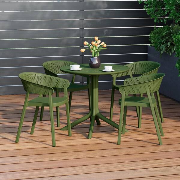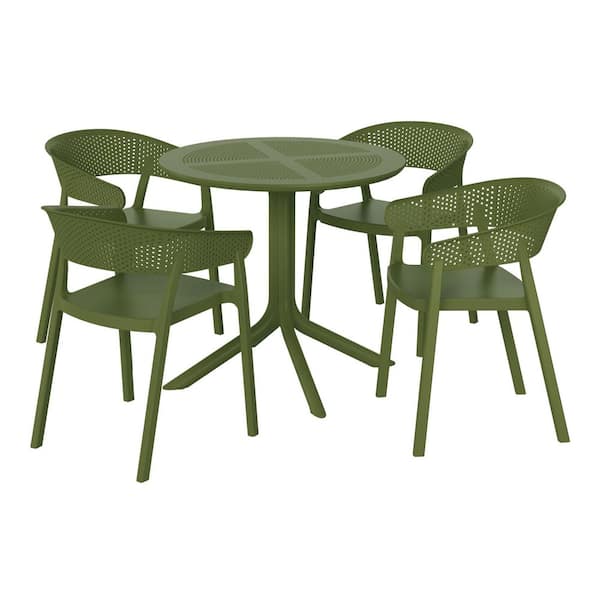 Frond and Form Modern Outdoor Patio Poly Plastic 5-Piece Round Table Dining Set w/ 4 Stackable Chairs in Olive Green