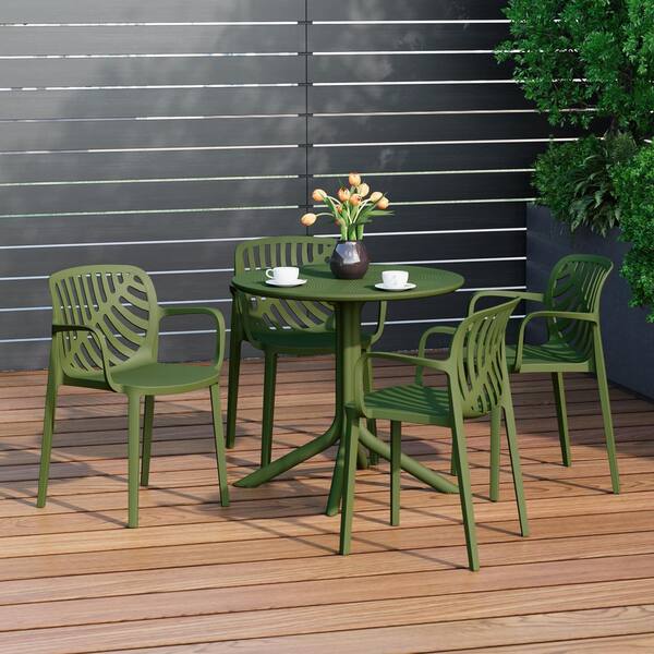 Frond and Form Modern Outdoor Patio Poly Plastic 5-Piece Round Table Dining Set w/ 4-Stackable Chairs in Olive Green