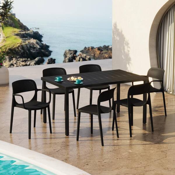 Frond and Form Modern Outdoor Patio Poly Plastic 7-Piece Rectangle Table Dining Set w/ 6 Stackable Chairs in Black