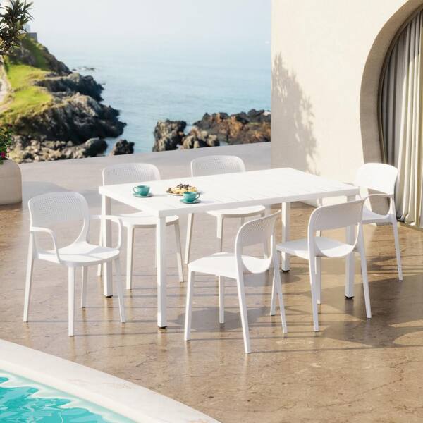 Frond and Form Modern Outdoor Patio Poly Plastic 7-Piece Rectangle Table Dining Set w/ 6 Stackable Chairs in White