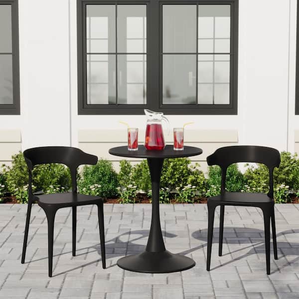 Frond and Form Outdoor Patio Modern 3-Piece Round HDPE Plastic Bistro Dining Set with Stackable Chairs, Black
