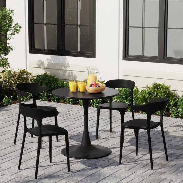 Frond and Form Outdoor Patio Modern 5-Piece Round HDPE Plastic Dining Table Set with Stackable Chairs, Black