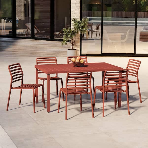 Frond and Form Outdoor Patio Modern 7-Piece Rectangular Steel Table, 6 Stackable HDPE Plastic Chairs Dining Set, Red