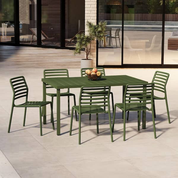 Frond and Form Outdoor Patio Modern 7-Piece Rectangular Steel Table, 6 Stackable Plastic Chairs Dining Set, Olive Green