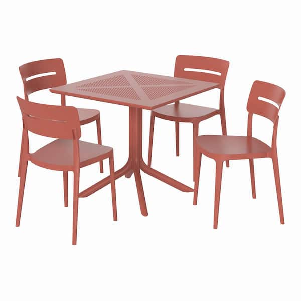 Frond and Form Red Plastic All Weather 5-Piece Square Table Modern Outdoor Patio Dining Set w/ 4 Stackable Chairs
