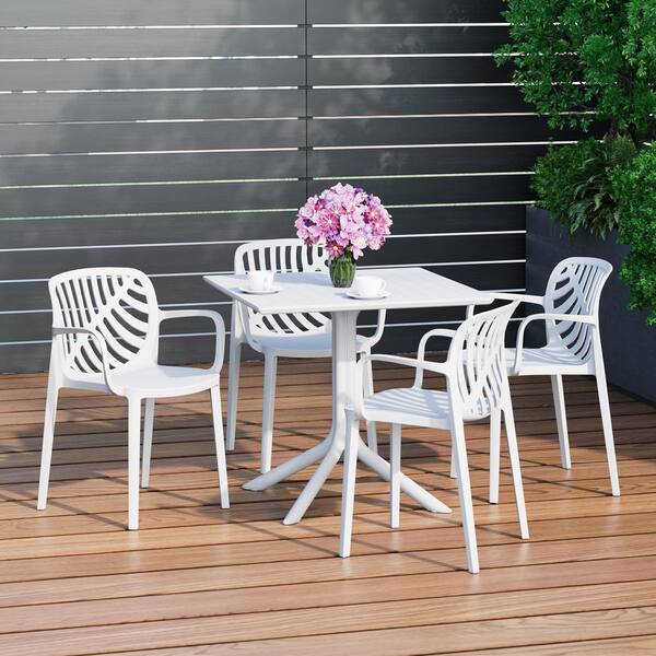 Frond and Form White Plastic All Weather 5-Piece Square Table Modern Outdoor Patio Dining Set w/ 4 Stackable Chairs