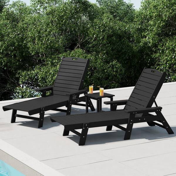 Harlo 3-Piece Black Fade Resistant HDPE Plastic Reclining Outdoor Patio Chaise Lounge Arm Chair and Table Set