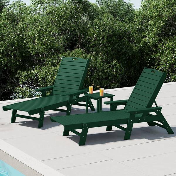 Harlo 3-Piece Dark Green Fade Resistant HDPE Plastic Reclining Outdoor Patio Chaise Lounge Arm Chair and Table Set