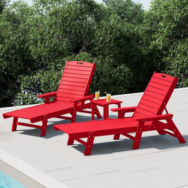 Harlo 3-Piece Red Fade Resistant HDPE Plastic Reclining Outdoor Patio Chaise Lounge Arm Chair and Table Set