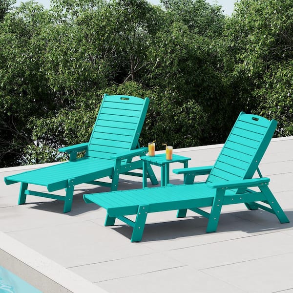 Harlo 3-Piece Turquoise Fade Resistant HDPE Plastic Reclining Outdoor Patio Chaise Lounge Arm Chair and Table Set