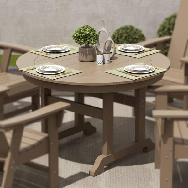 Hayes 47 in. All Weather HDPE Plastic Round Outdoor Dining Trestle Table with Umbrella Hole in Weathered Wood