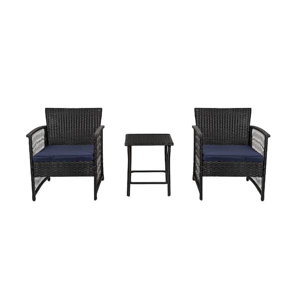 Highland 3-Piece Woven Rattan Wicker Patio Conversation Seating Set with Black/Navy Cushions