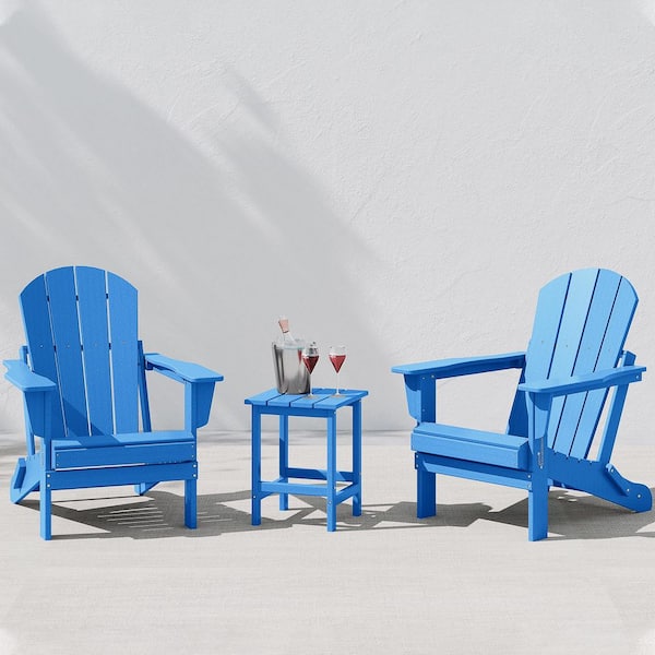 Laguna 3-Piece Fade Resistant Outdoor Patio HDPE Poly Plastic Folding Adirondack Chair Set, Side Table in Pacific Blue