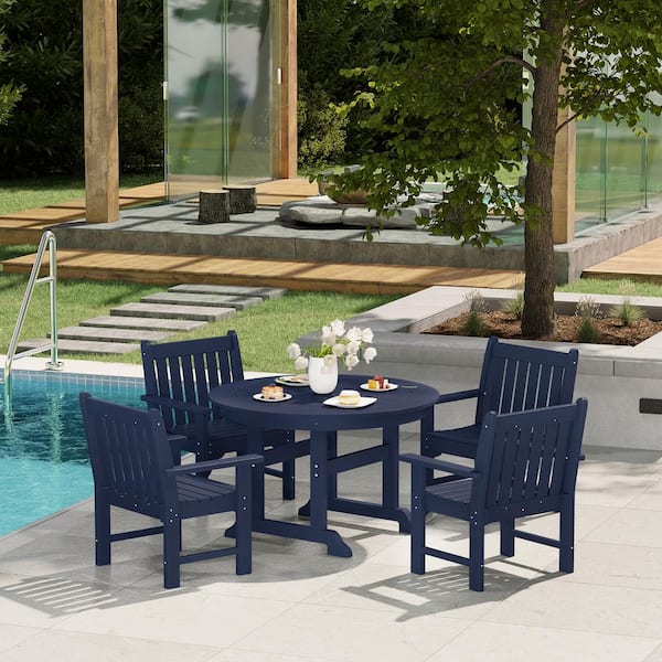 Laguna 5-PCOutdoor Patio Poly Plastic Fade Resistant Garden Arm Chair and Round Trestle Table Dining Set in Navy Blue